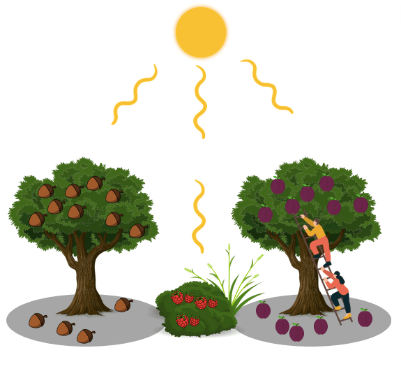 In the space between the trees where light hits the ground, shrubs, grasses, and flowers have room to flourish. These support unique species, and also can provide additional sources of human food.