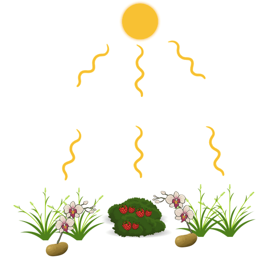 Plants are machines that turn light into living material (including food like fruits and vegetables). For the purposes of this topic, we can imagine plants like a mathematical equation: