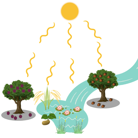 This means that areas with a lot of light, moisture, and nutritious soils, will usually produce the most amount of food. The more you restrict these (like very shady areas, very dry areas, or very low soil-nutrient areas) the more you have limits on plant growth.