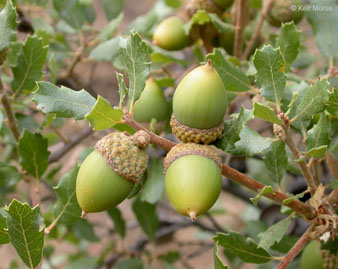 All oaks produce acorns, and all acorns have tannins. These are bitter chemicals found in foods like black tea and dark leafy greens. If you pick up an acorn, crack the shell, and taste the nut inside, you will find it’s so tannic it seems inedible. Tannins naturally dissolve into water (like tea brewing), and so many cultural practices around eating acorns involve using water to draw out the biter compounds (called leeching). Cold leeching takes longer and uses cold water, and hot leeching uses simmering or boiling water. We’ll talk in a later section about some methods for leeching. White oaks tend to have fewer tannins, which also makes them more desirable to animals like squirrel and deer.