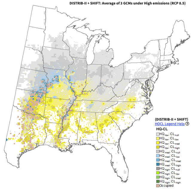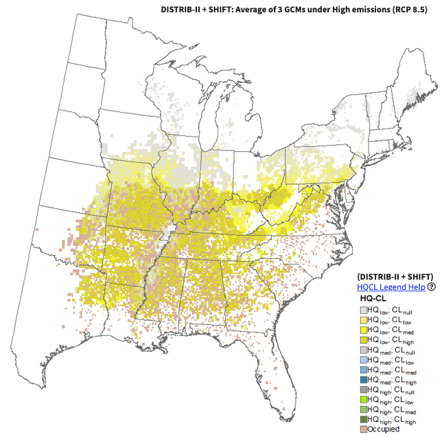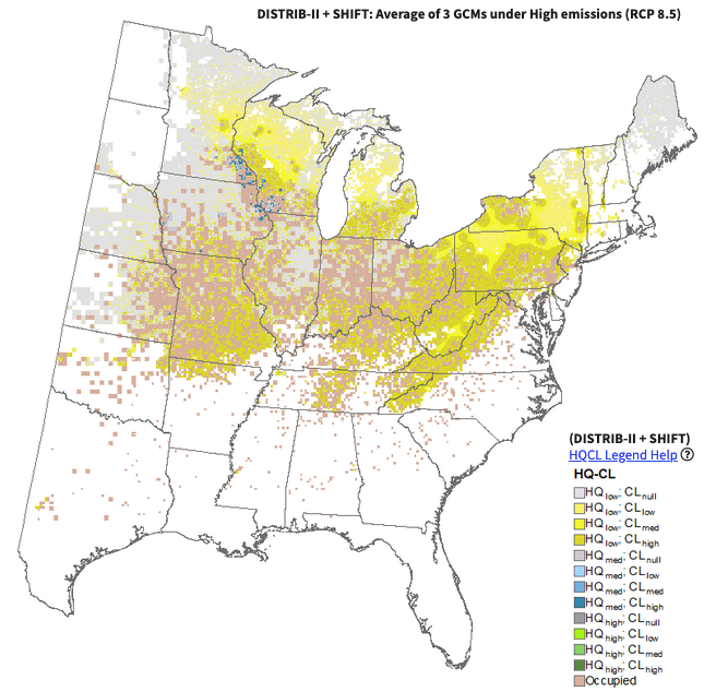 People wanting to grow trees should look for high-quality habitat, and ideally ones where the trees may naturally move in the next century. Grey areas can clue the reader into potential population grounds for assisted migrations, or potential orchard locations.