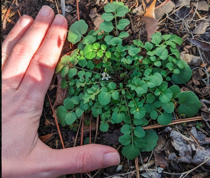 Hairy bittercress is a wild relative of broccoli. They’re a common garden weed that pop up in the cooler months of spring and fall. You can often find them on top of mulch, in garden beds not recently weeded, and the edges of fields.