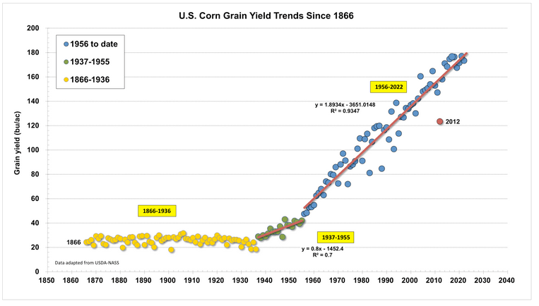 The Haber-Bosch process revolutionized life on earth. By burning natural gas they were able to produce a synthetic form of ammonia. Food production accelerated around the world. Every graph that shows agricultural yields has a distinct ‘before’ and ‘after’ you can point to – which is the moment that the synthetic fertilizer process became available. This turning point is known as the Green Revolution, and signifies the moment when modern crop breeding and synthetic nitrogen produced more food than our ancestors could have ever imagined.
